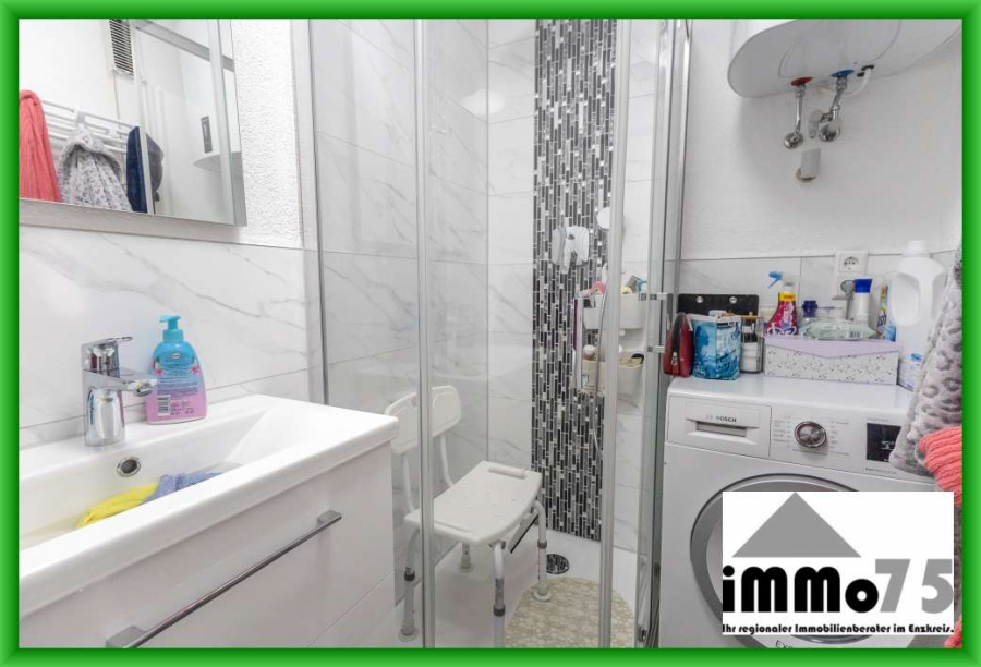 Das Badezimmer überzeugt mit einer modernen Dusche und einem praktischen Stellplatz für die Waschmaschine, sodass alles seinen Platz findet. Das separate WC sorgt zusätzlich für Komfort im Alltag.